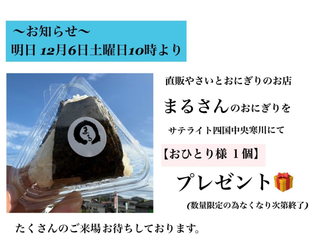 直販やさいとおにぎりのお店まるさんのおにぎりをサテライト四国中央寒川にておひとり様1個プレゼント致します。